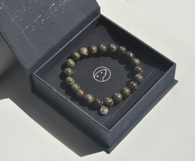Beaded Bloodstone Bracelet made with AAA grade natural crystal, featuring our signature otter medallion. Bloodstone is the courage stone. It empowers you to walk your talk with confidence, strength, and fearless determination.
