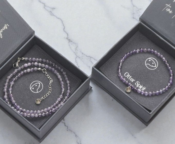 Meet the Amethyst Beaded Duo — a delicate two-piece set designed to connect you with the soothing and protective energy of Amethyst. This set includes a beaded necklace and a matching bracelet, each crafted from AAA-grade Amethyst gemstones and finished with our signature otter medallion.