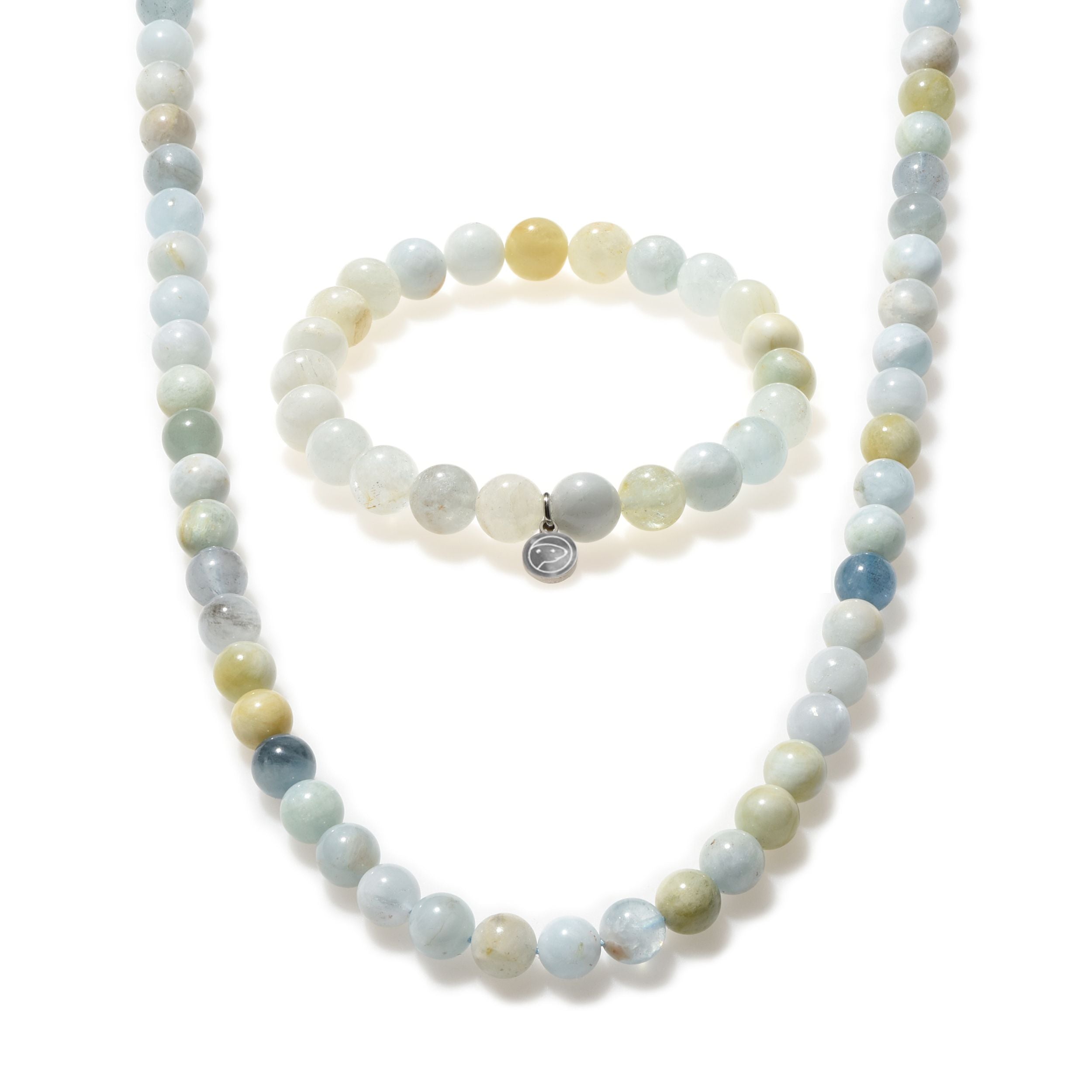 Beaded Aquamarine Necklace made with A grade natural crystal, featuring our signature otter medallion. Aquamarine is the soothing stone. Known for its calming properties, it promotes inner peace, clarity of mind, and clear communication.