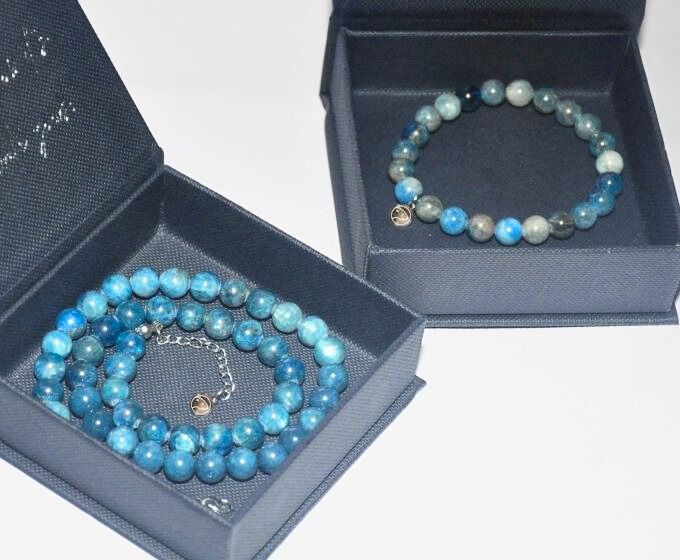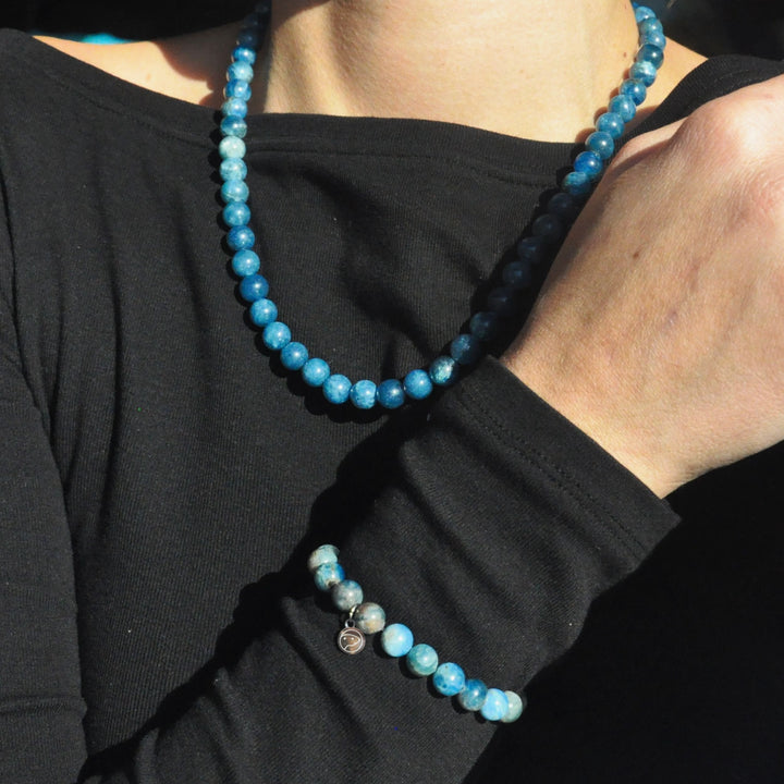 Meet the Blue Apatite Beaded Duo — a delicate two-piece set designed to connect you with the inspiring and motivating energy of Blue Apatite. This set includes a beaded necklace and a matching bracelet, each crafted from AA-grade Blue Apatite gemstones and featuring our signature otter medallion.