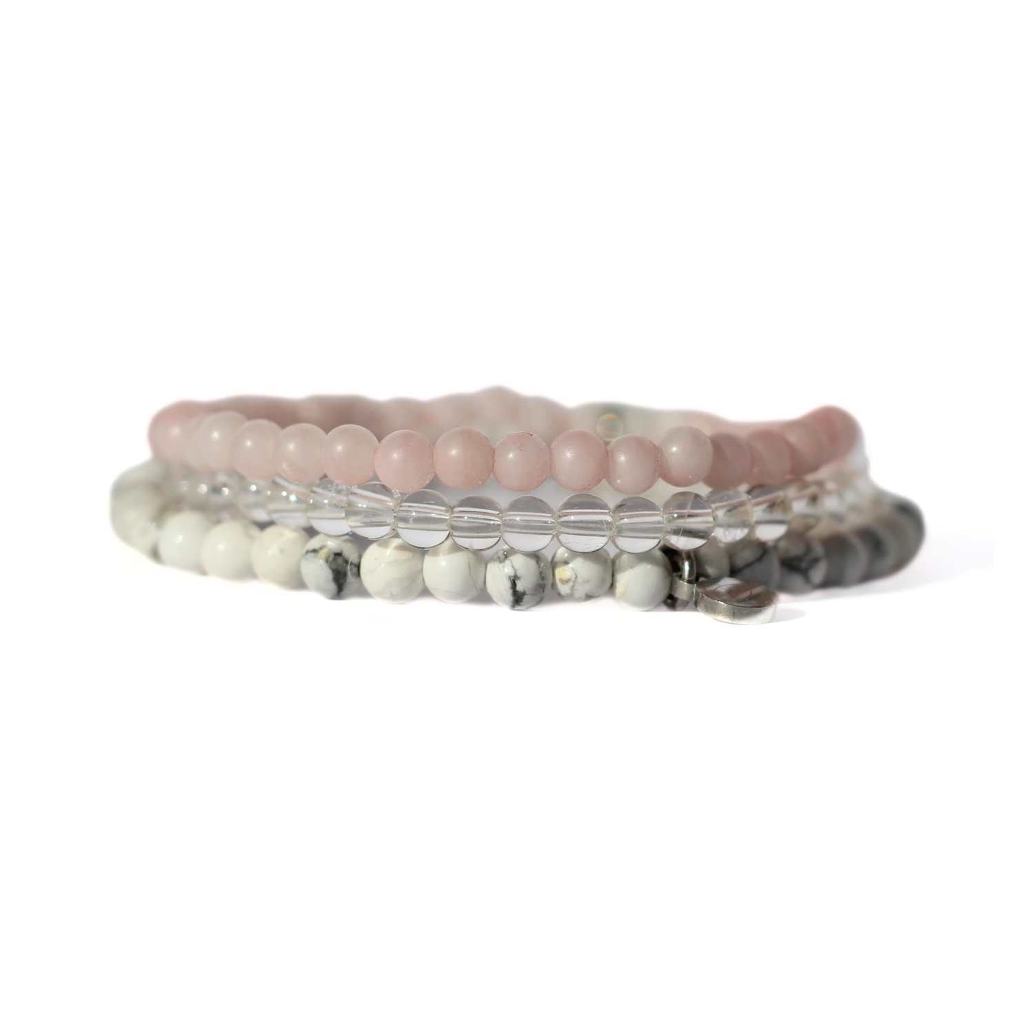 Designed to strengthen bonds and bring peace, this set carries warmth and harmony. Rhodonite nurtures compassion and forgiveness, Celestite inspires calm and spiritual connection, while Howlite encourages patience and understanding.