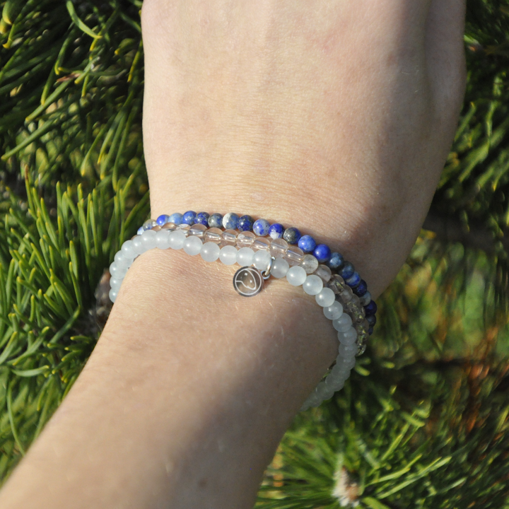 It embodies the crisp, icy charm of winter—cool, bright, and refreshing. Lapis Lazuli brings depth, wisdom, and inner stillness, Clear Quartz amplifies intentions and offers clarity, while Skyblue Jade adds gentle harmony, soothing energy, and a soft touch of winter calm.