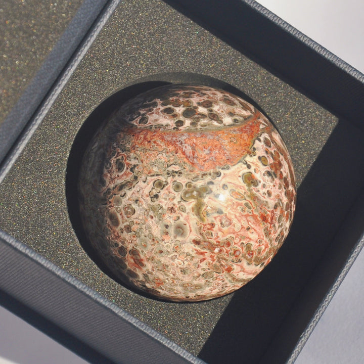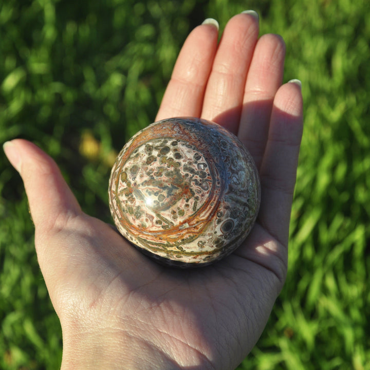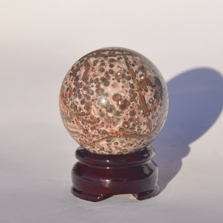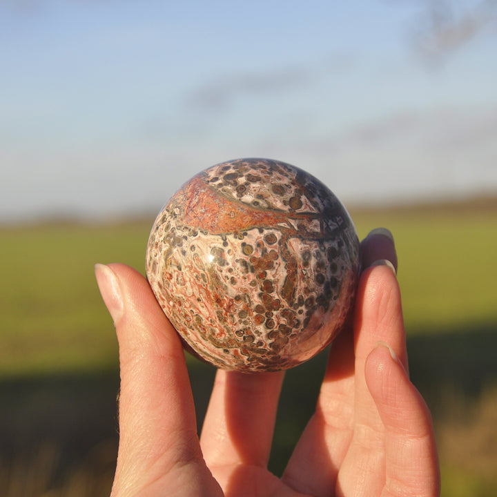 Leopard Skin Sphere made with AA grade natural crystal. Leopard Skin Jasper is the grounding stone. It offers protection while promoting strength, courage, and confidence.