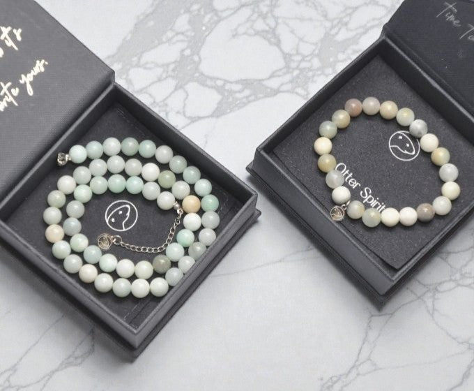 Meet the Multi-Amazonite Beaded Duo — a soothing two-piece set designed to balance emotions, invite calm confidence, and encourage honest self-expression. This set includes a beaded necklace and a matching bracelet, each handcrafted from AA-grade Multi Amazonite gemstones and adorned with our signature otter medallion.