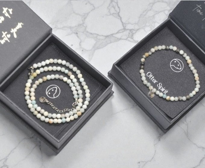 Meet the Multi-Amazonite Beaded Duo — a soothing two-piece set designed to balance emotions, invite calm confidence, and encourage honest self-expression. This set includes a beaded necklace and a matching bracelet, each handcrafted from AA-grade Multi Amazonite gemstones and adorned with our signature otter medallion.