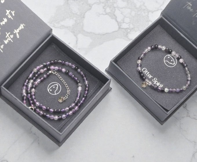Meet the Purple Fluorite Beaded Duo — a calming two-piece set designed to clear the mind, strengthen intuition, and restore energetic balance. This set includes a beaded necklace and a matching bracelet, each handcrafted from AAA-grade Purple Fluorite gemstones and adorned with our signature otter medallion.