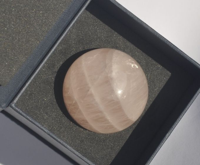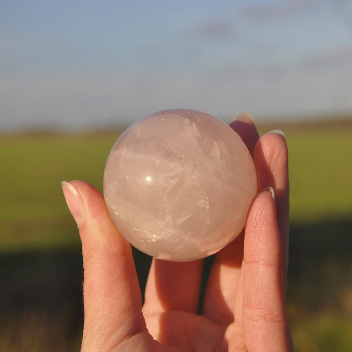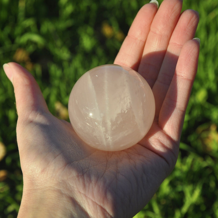 Rose Quartz Sphere made with AAA grade natural crystal. Rose Quartz is the love stone. It opens the heart to compassion, self-love, and healing, fostering harmony, forgiveness, and deeper connections.