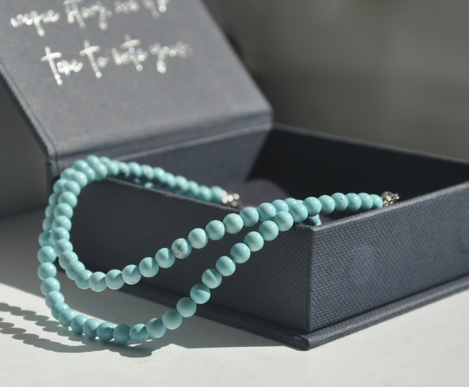 Beaded Turquoise Necklace made with AA grade natural crystal, featuring our signature otter medallion. Turquoise is the healing stone. It supports emotional balance, clear communication, and spiritual attunement, nurturing inner wisdom and serenity.